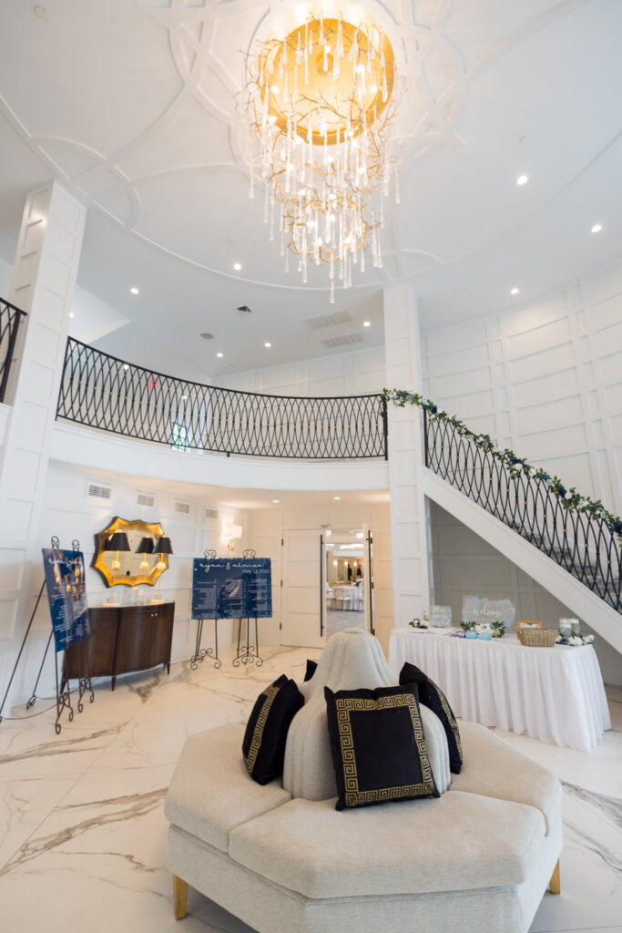 Two Getting-Ready Suites – Accessed via a marble lobby and wrought-iron stairs, these elegant suites feature plush furnishings, balcony views, and calm spaces for the bridal party to gather before the ceremony.